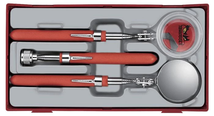 Set d’inspection de 3 outils télescopiques. Comprend 1 miroir d’inspection, 1 loupe et 1 aimant. Tous les trois sur clip de transport. TC-tray.