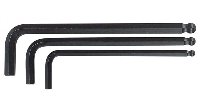 Clé Allen de forme L. Acier chrome vanadium. Exécution noire. Avec tête sphérique du côté long de la clé. Cette tête sphérique donne la possibilité de tourner sous un angle de 30°.