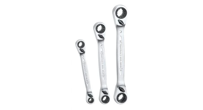 Set de 3 clés à cliquet doubles avec différentes tailles 12-pans à chaque extrémité.