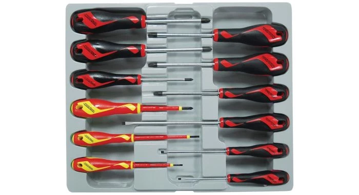 Jeu de 12 tournevis Plat, PH, PZ et TX. Trois tournevis 1000 volt isolés. Avec une poignée ergonomique deux composants noire et rouge. Livré dans un tray en pvc.