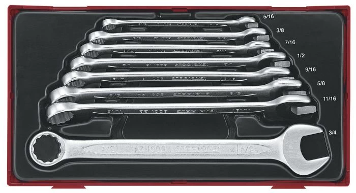 Set de 8 Clés mixtes: AF allant de 5/16″ à 3/4″ . Le côté de la clé a une inclinaison de 15°. Tailles: identiques des deux côtés de la clé. TC-tray.