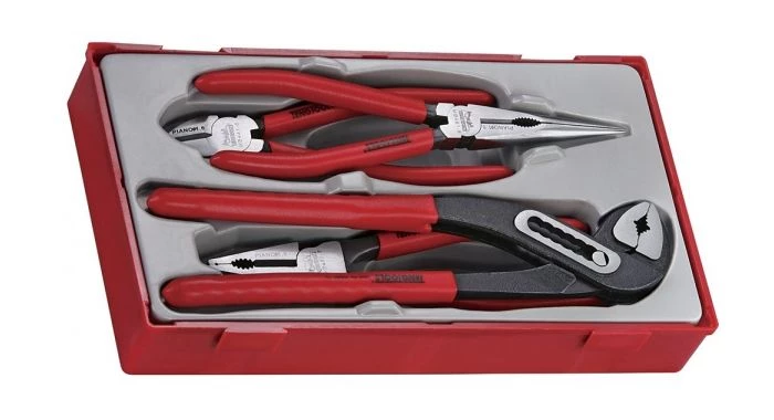 Jeu de 4 pinces Mega Bite comprenant 1 pince multiprise 250 mm, 1 pince diagonale 150mm, 1 pince à bec long 200mm et 1 pince universelle 175mm. Avec un revêtement vinyle antidérapant rouge et noire. TC-tray.