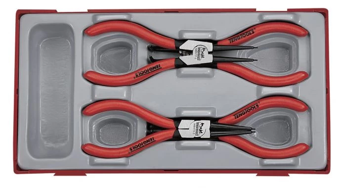 Set de 4 pinces circlips L.175mm comprenant 1 interne droite, 1 externe droite, 1 courbée interne et 1 courbée externe. TC-tray.