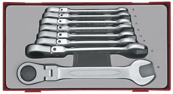 Set de 8 Clés mixtes: racagnac-swivel allant de 8 à 19mm. Côté Swivel pliable à 180°. Tailles: identiques des deux côtés de la clé. TC-tray.