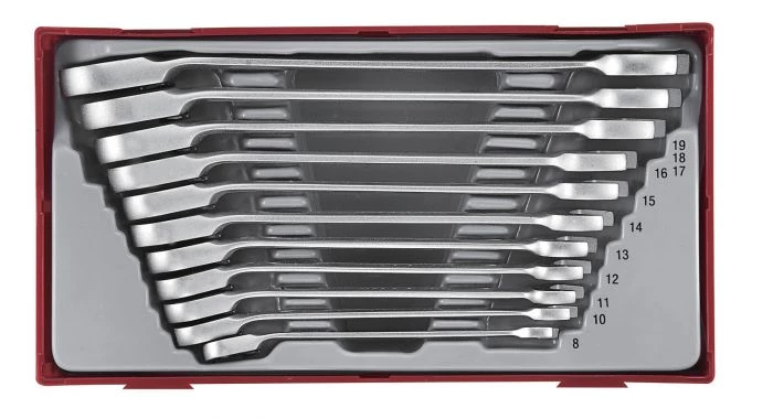 Jeu de 11 Clés mixtes: à cliquet. Clé à fourche d’un côté et clé à 12 pans de l’autre. Cliquet réversible par levier. Tailles: identique aux deux extrémités.