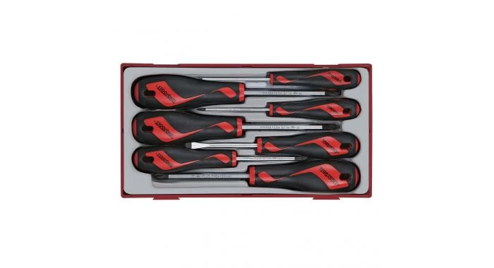 Set de 7 tournevis plats, PH et PZ. Acier TT-MV PLUS. Manche ergonomique deux composants avec trou de suspension. TC tray.