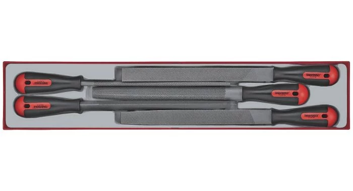 Set de 5 limes à main L. 250mm taille médium comprenant divers modèles : 1 ronde, 1 demi-ronde, 1 carrée, triangulaire 1 plate. TC-tray.