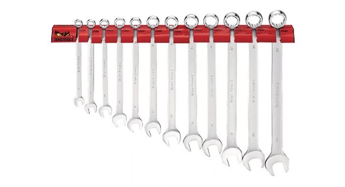 Jeu de 12 clés mixtes extra longues sur support mural.